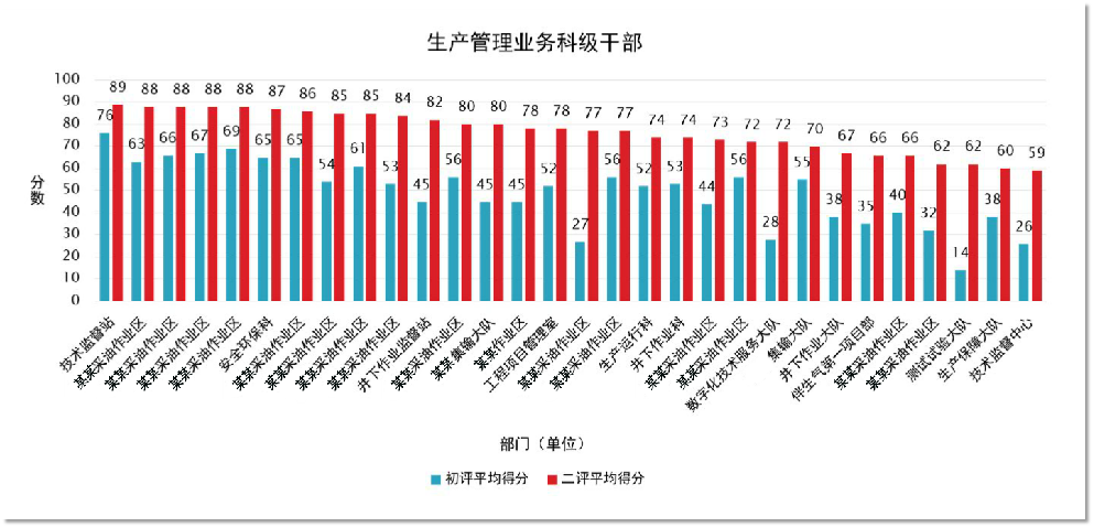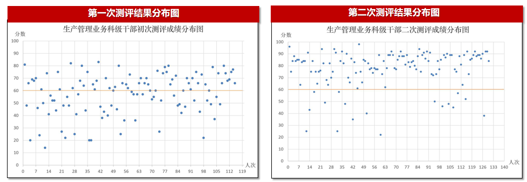 | 以“生產(chǎn)管理業(yè)務(wù)科技干部”為例,同一部門“兩次”測評結(jié)果分布圖,每個“點(diǎn)”代表該部門的一個員工(見下圖)。 | |||||||