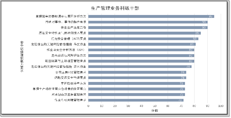 | 以“生產(chǎn)管理業(yè)務(wù)科技干部”為例,精準(zhǔn)掌握每類人員“安全履職能力”的強(qiáng)弱項(xiàng)(見下圖) | |||||||
